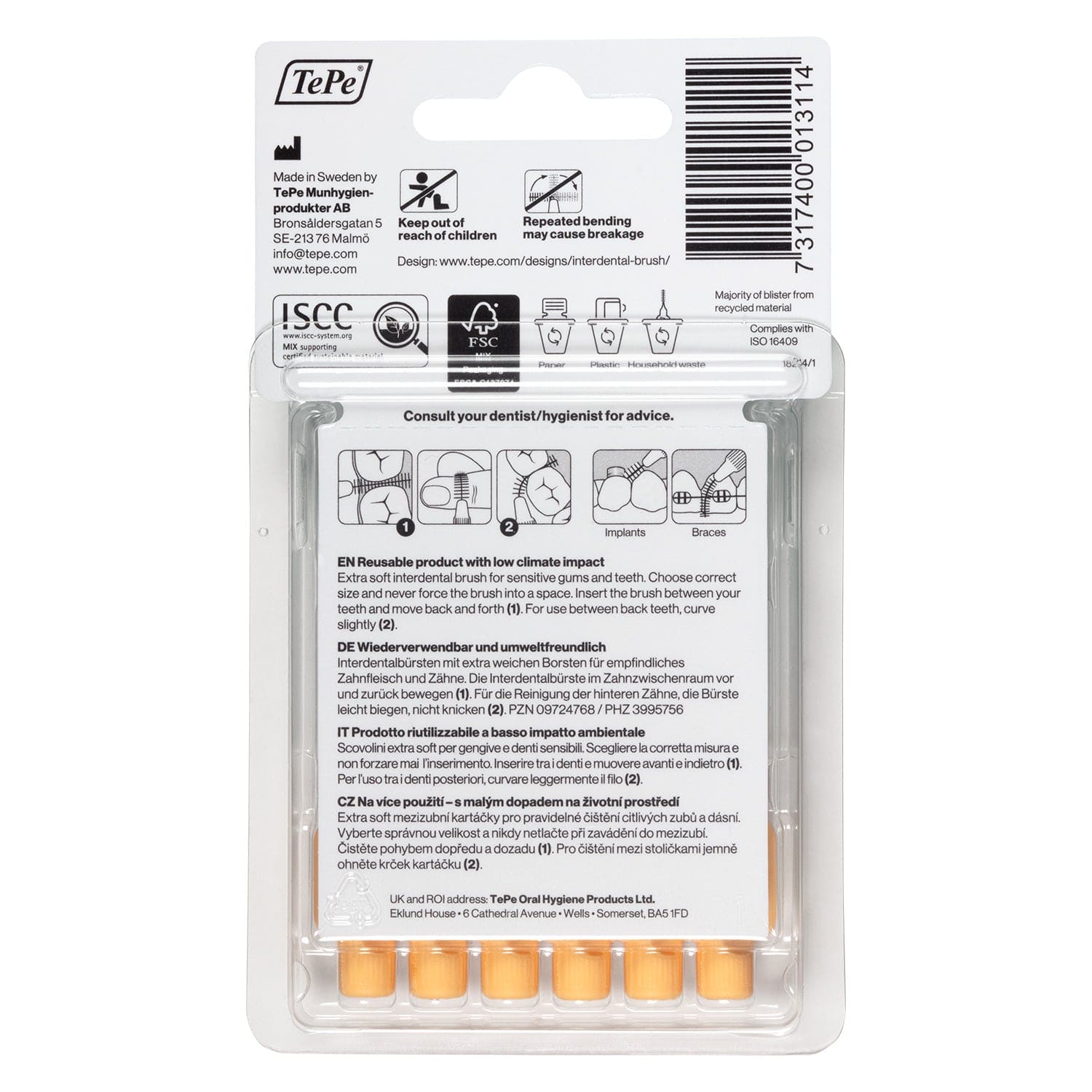 - El cepillo interdental TePe tiene el alambre revestido de poliuretano para una limpieza segura y delicada y no le hará daño ni le provocarán calambres, aunque lleve implantes o aparato de ortodoncia.
