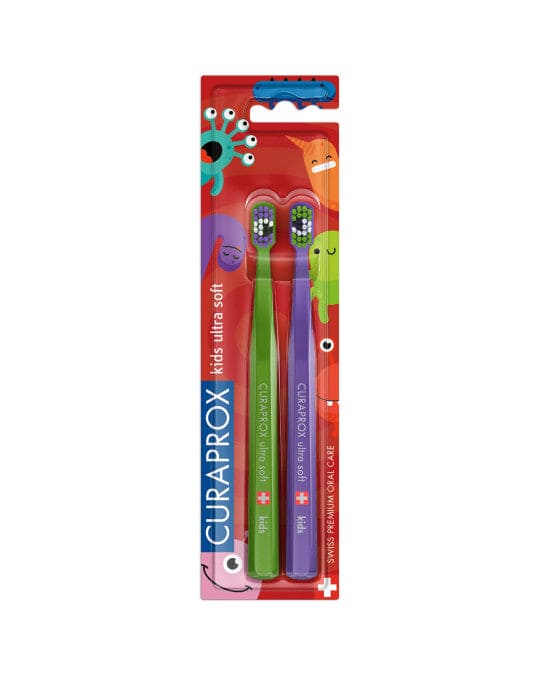 Cepillo de dientes verde brillante y violeta intenso para tus hijos. Inspirado en las bacterias para hacer que tus pequeños se diviertan cepillándose los dientes.
